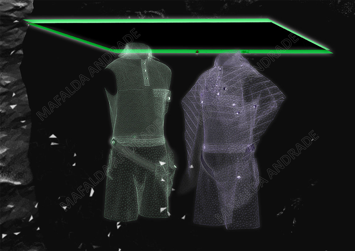 Two piece outfit consisting of a padded poncho, a sleeveless shorts boilersuit with an irregular collar and a waist bag