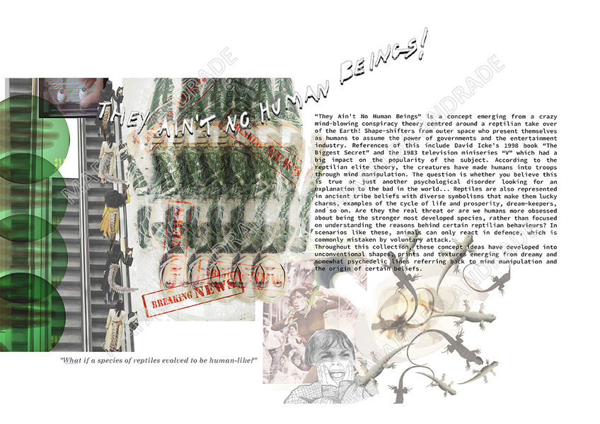 In this collection, the reptilian conspiracy theory concept ideas have developed into unconventional shapes, prints and textures emerging from dreamy and somewhat psychedelic lines referring back to mind manipulation and the origin of certain beliefs. By collecting garments from my wardrobe, including a tailored suit inherited from my mom, I started developing designs that focus on diversity of women’s and men’s footwear types that can be dressy, casual or sporty, providing a wider variety of choice to the customer. To present my collection I have chosen a sneaker, a long boot, a chunky sandal and a derby shoe and broke down the last two pieces into more technical detail so as to explain how these would translate into production terms.
