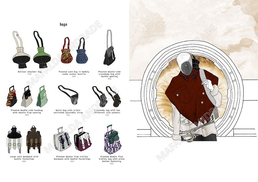 In this collection, the reptilian conspiracy theory concept ideas have developed into unconventional shapes, prints and textures emerging from dreamy and somewhat psychedelic lines referring back to mind manipulation and the origin of certain beliefs. By collecting garments from my wardrobe and fabric samples, I started manipulating fabric by gathering sewing lines, doing diverse pleat work and playing around with homemade prints. From that I developed designs that focus on diversity of accessories including bags, gloves, leg warmers, socks and scarves. To present the accessories collection, the chosen products were combined in a range plan including different colour and textile options for each style, providing a wider variety of choice to the customer.